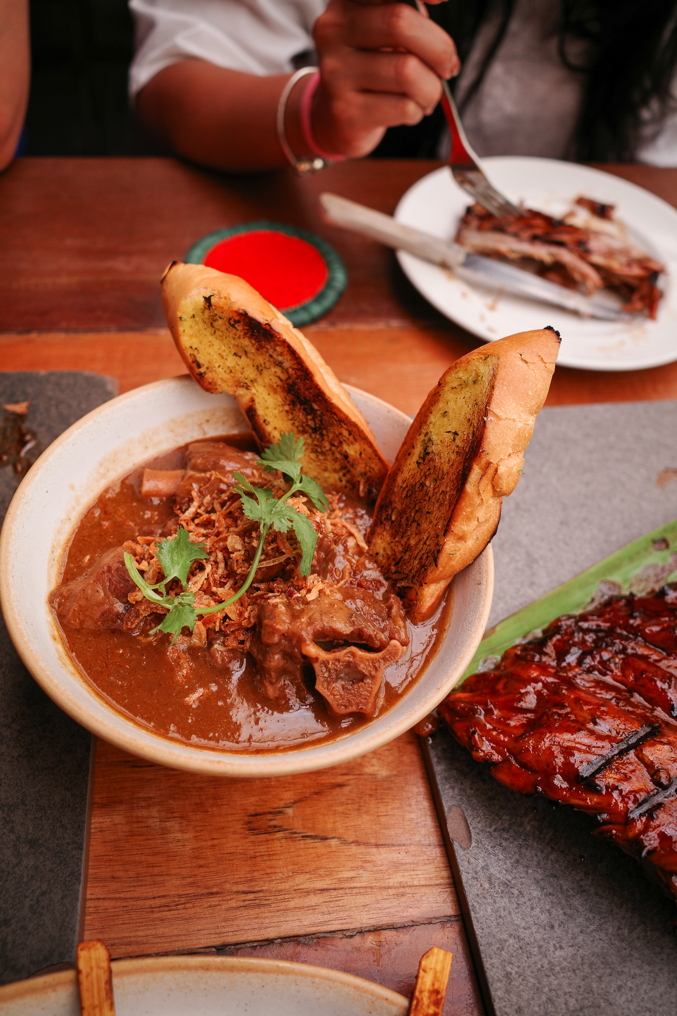 데이빋과 엉을 기다리며 애피타이저로 돼지고기 사태(사태는 동남아 지역의 꼬치이다. 보통은 소고기, 닭, 양고기로 이뤄져있고 무슬림 국가들이 많은 특성상 돼지고기는 찾아보기 힘들다.)를 시켰다.